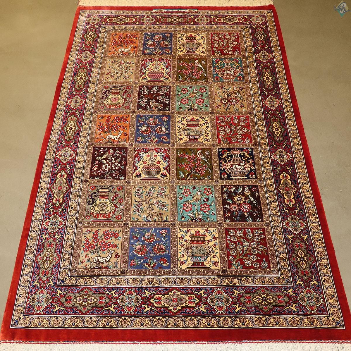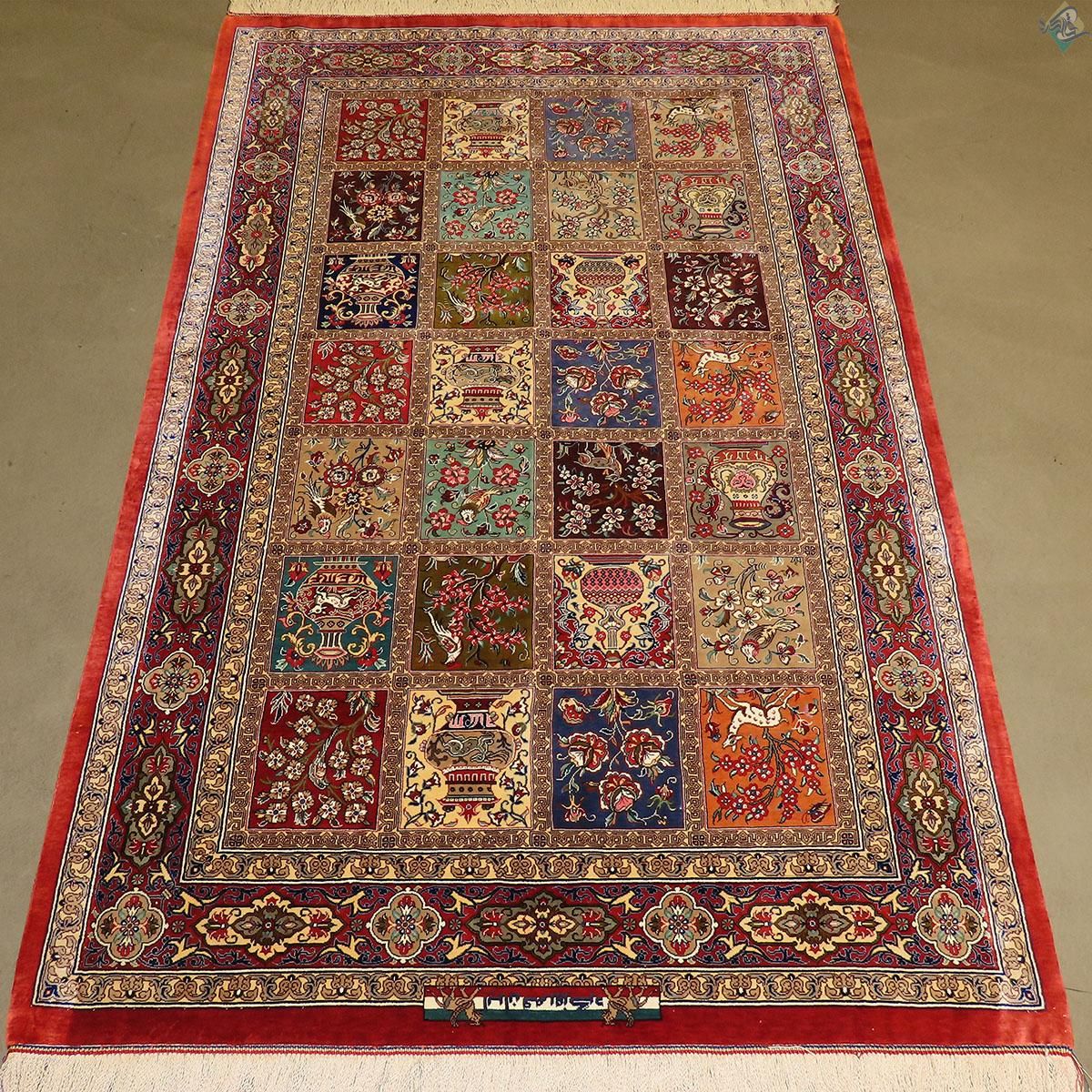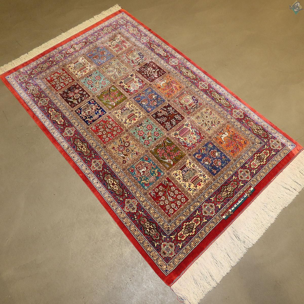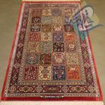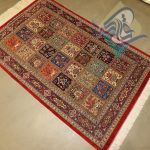 فرش دستباف قم کاملا ابریشمی تولیدی روزگرد و نقش خشتی شیرین بسیار دکوراتیو ساز زرونیم