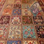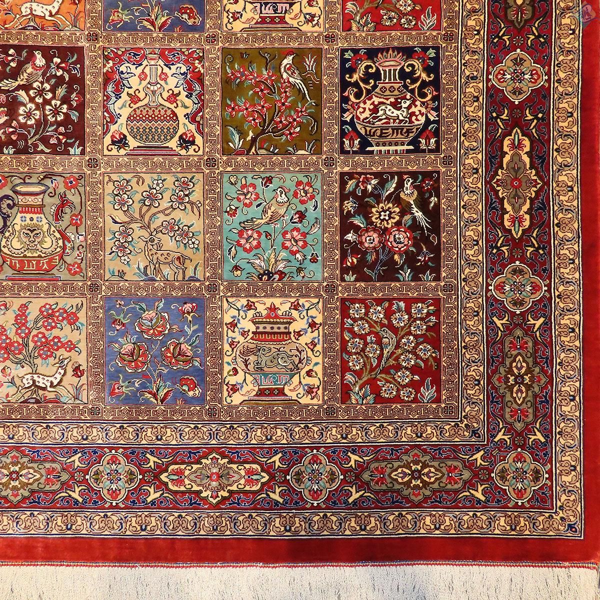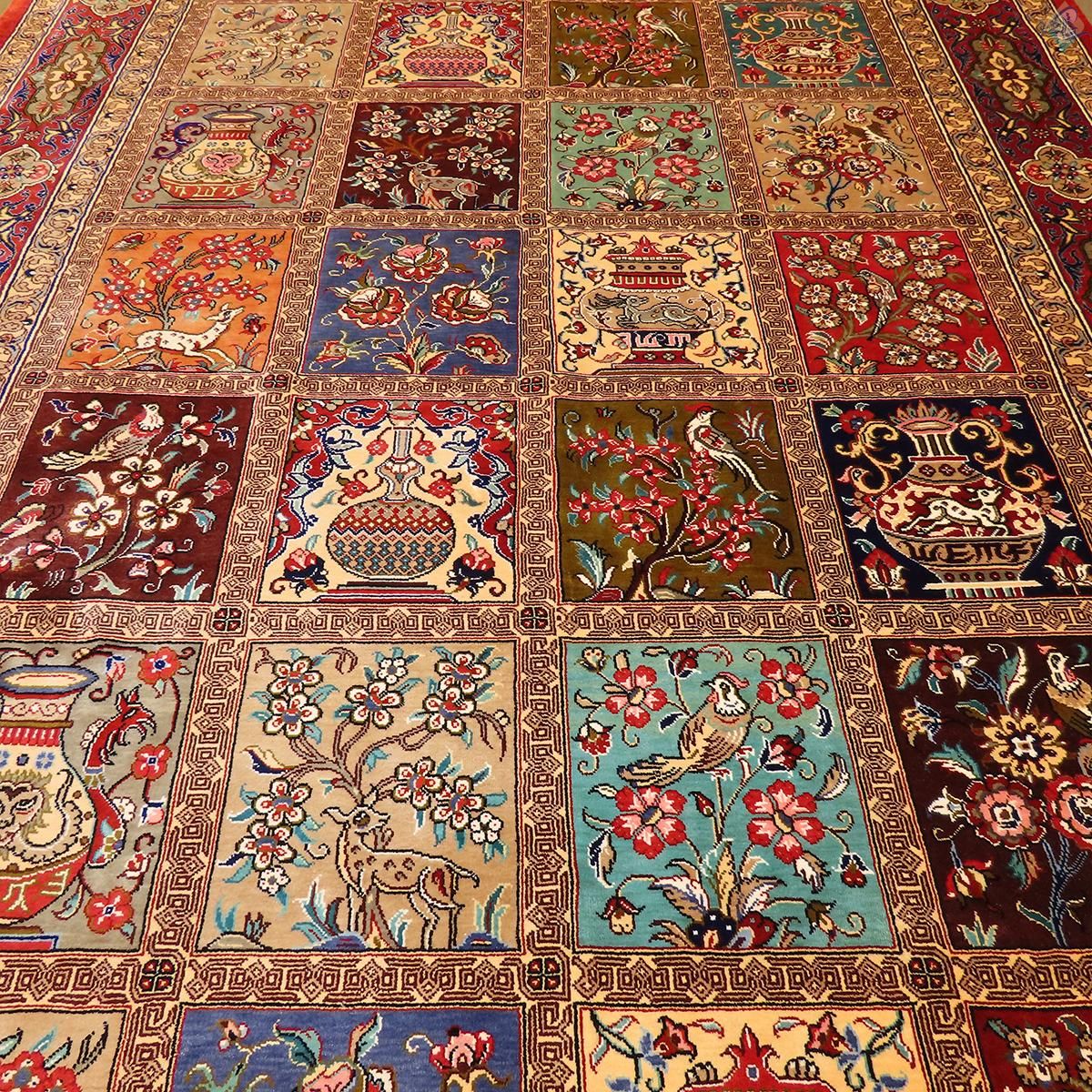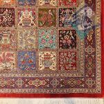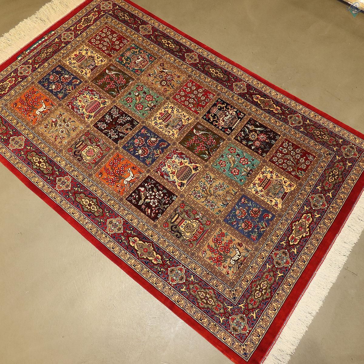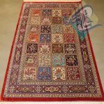 فرش دستباف قم کاملا ابریشمی تولیدی روزگرد و نقش خشتی شیرین بسیار دکوراتیو ساز زرونیم