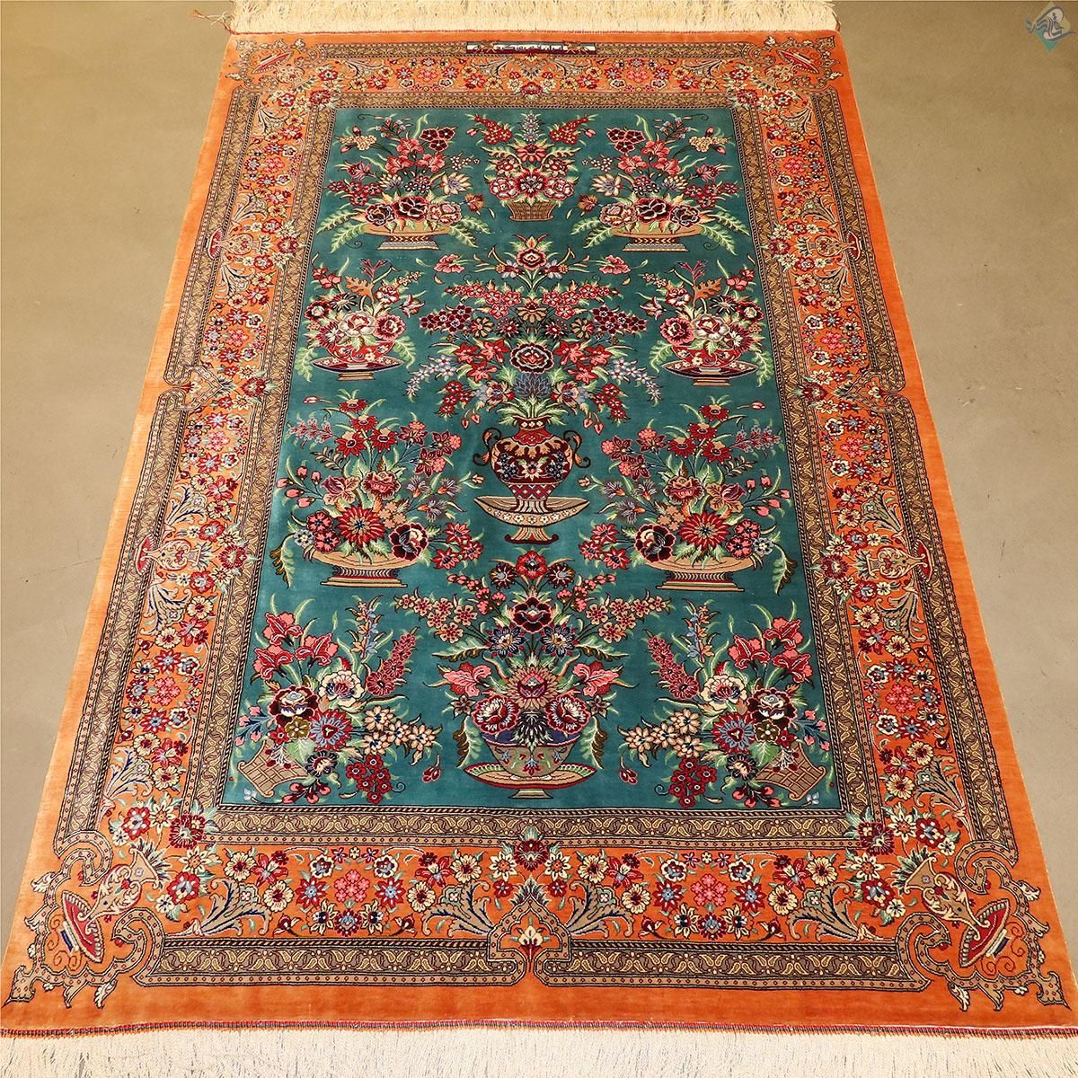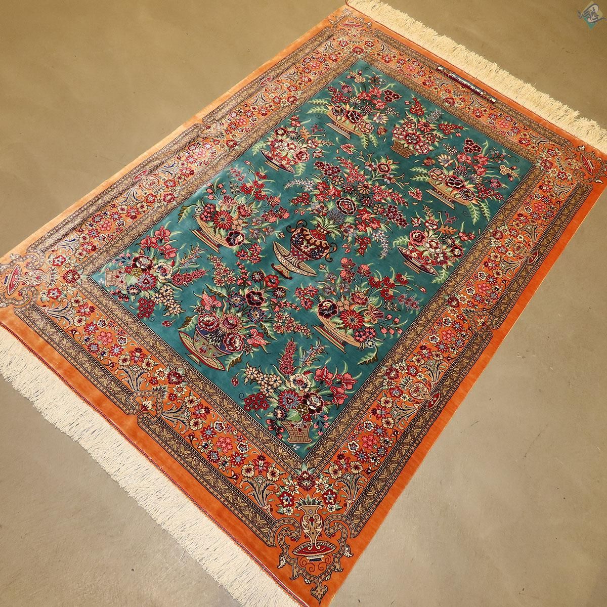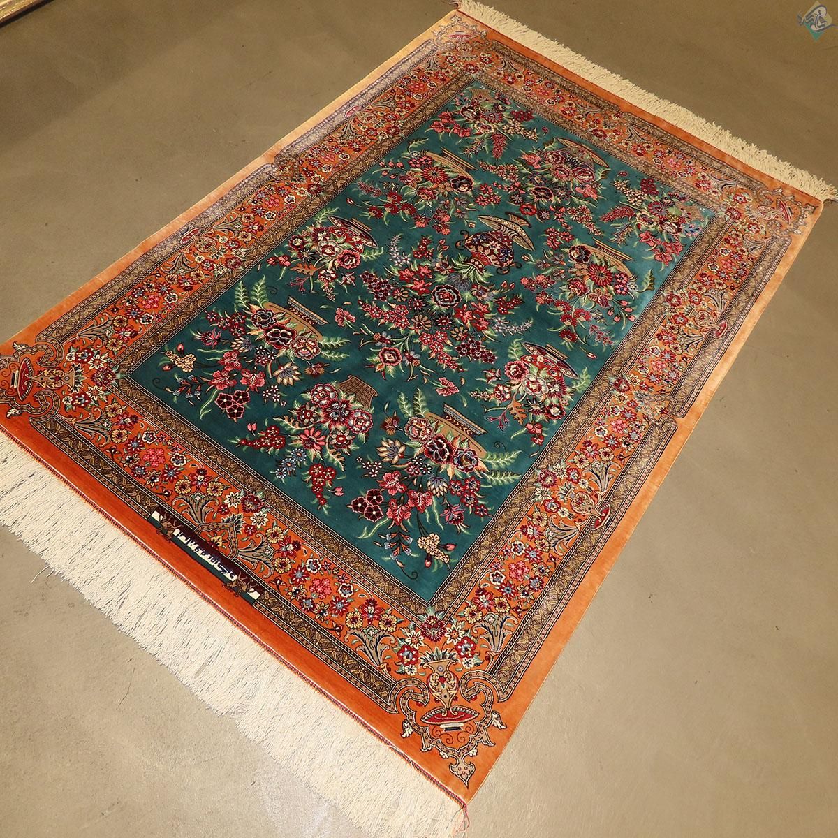 ذرع و نیم دستباف تمام ابریشم قم طرح گلدانی تولیدی روزگرد هشتاد رج