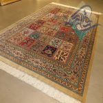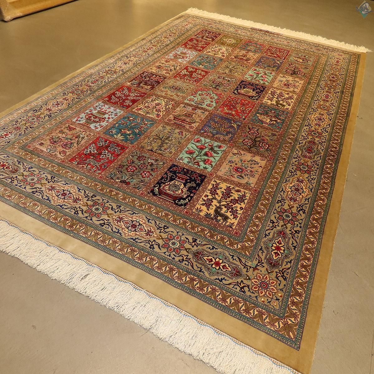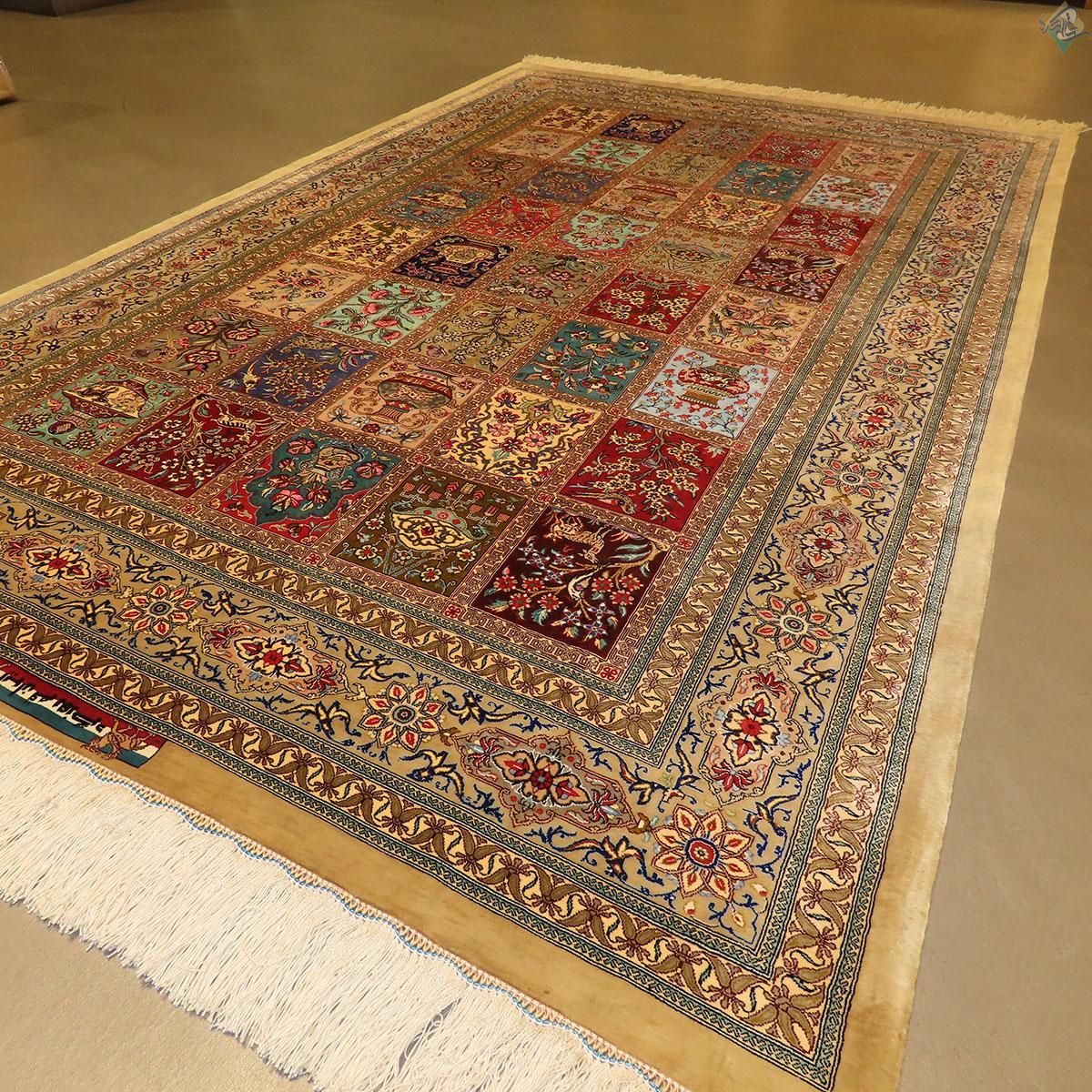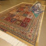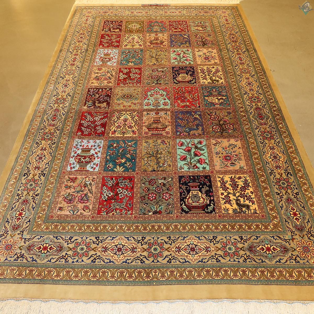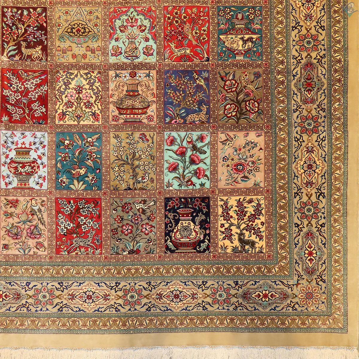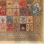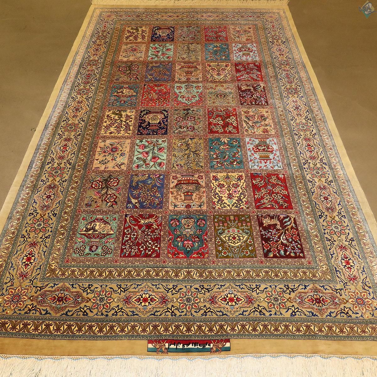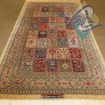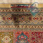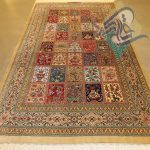 قالیچه دستباف تمام ابریشم قم طرح خشت تلخ و شیرین تولیدی روزگرد قم