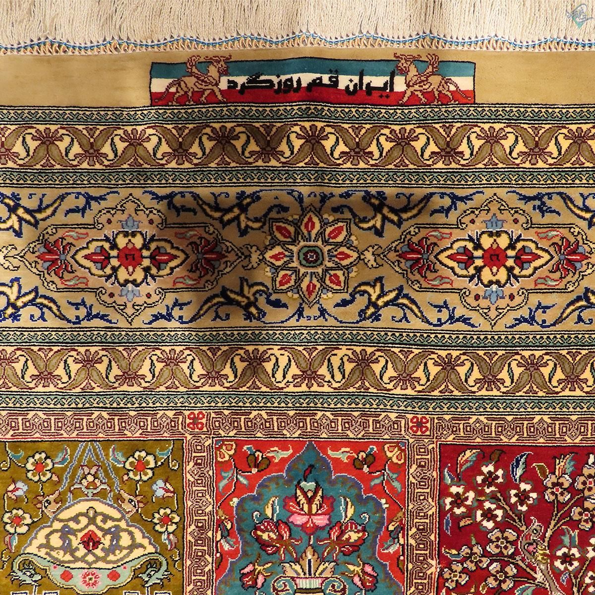 فرش دستبافت تمامی کامل ابریشمی قم مارک روزگرد نقشه نادر و کمیاب تلخ و شیرین بسیار از لحاظ رنگ بندی خاص است