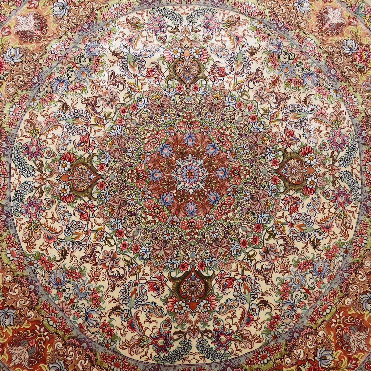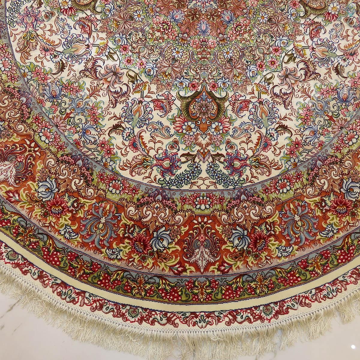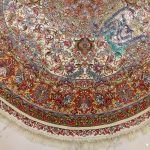 قالی دستبافت تبریز با شکل هندسی دایره و قطر دو متر طرح جدید خطیبی ریشه و گل و کف متن و کف حاشیه ابریشم شصت رج واقعی بسیار دکوراتیو